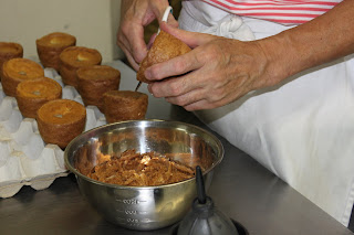 After the totoros are nice and crisp, they cut off the bottoms and prepare them for the delicious cream filling!